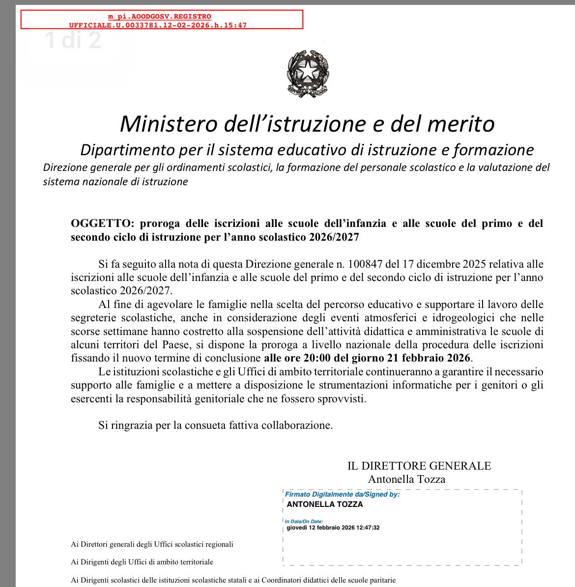 Disposta la proroga , a livello nazionale, delle iscrizioni alle scuole : infanzia , primaria e secondaria di primo grado, alle ore 20 del giorno 21 febbraio